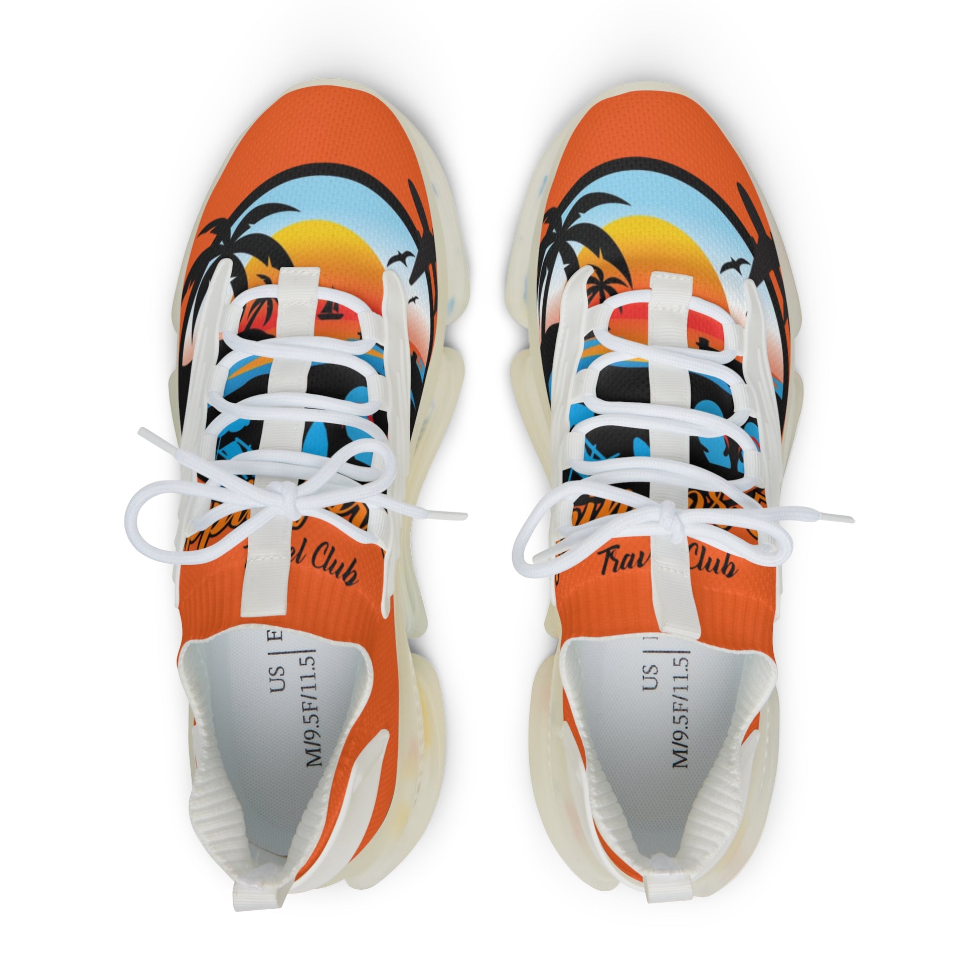 These lightweight mesh sneakers carry a sun-soaked, coastal vibe — bright orange mesh knit printed with a retro sunset and palm silhouettes. They feel airy on long walks, with breathable deodorant memory foam that keeps feet cool and comfortable. The EVA midsole cushions each step while the TPU/EVA shock layer smooths impacts, so mornings at the boardwalk or weekend errands stay effortless. Durable KPU accents hold up through weather and wear, and clean lace-up styling with contrasting black or white stitching keeps the look sharp. Pack them for warm-weather trips or slip them on for everyday city strolls where color and comfort matter.